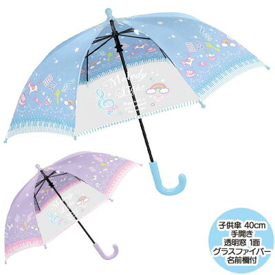 キッズ雨傘 子供用傘 メロディライト 40cm 手開き傘 送料無料 代引手数料別 子供用 通園 通学 入園 入学 女の子 女児 ユニコーン レインボー 虹 ブルー パープル ラベンダー 長傘 かさ カサ 手開き かわいい ゆめかわいい 名前欄付き 透明窓 Room